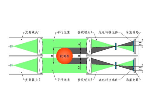 圖中2套發(fā)射鏡頭分別發(fā)射出平行光射向2套接收鏡頭,通過(guò)接收鏡頭內(nèi)的透鏡使平行光束在光電轉(zhuǎn)換元件CCD芯片上成像。當(dāng)2束平行光內(nèi)放入被測(cè)物時(shí),在光電轉(zhuǎn)換元件的像上就會(huì)出現(xiàn)陰影,設(shè)其寬度分別為L(zhǎng)1、L2。經(jīng)過(guò)對(duì)光電轉(zhuǎn)換元件發(fā)出的電信號(hào)的處理和計(jì)算可以得出L1、L2所對(duì)應(yīng)的尺寸A1、A2,A1加A2再加上兩個(gè)鏡頭之間的凈間距B即可得出被測(cè)物的尺寸D。
