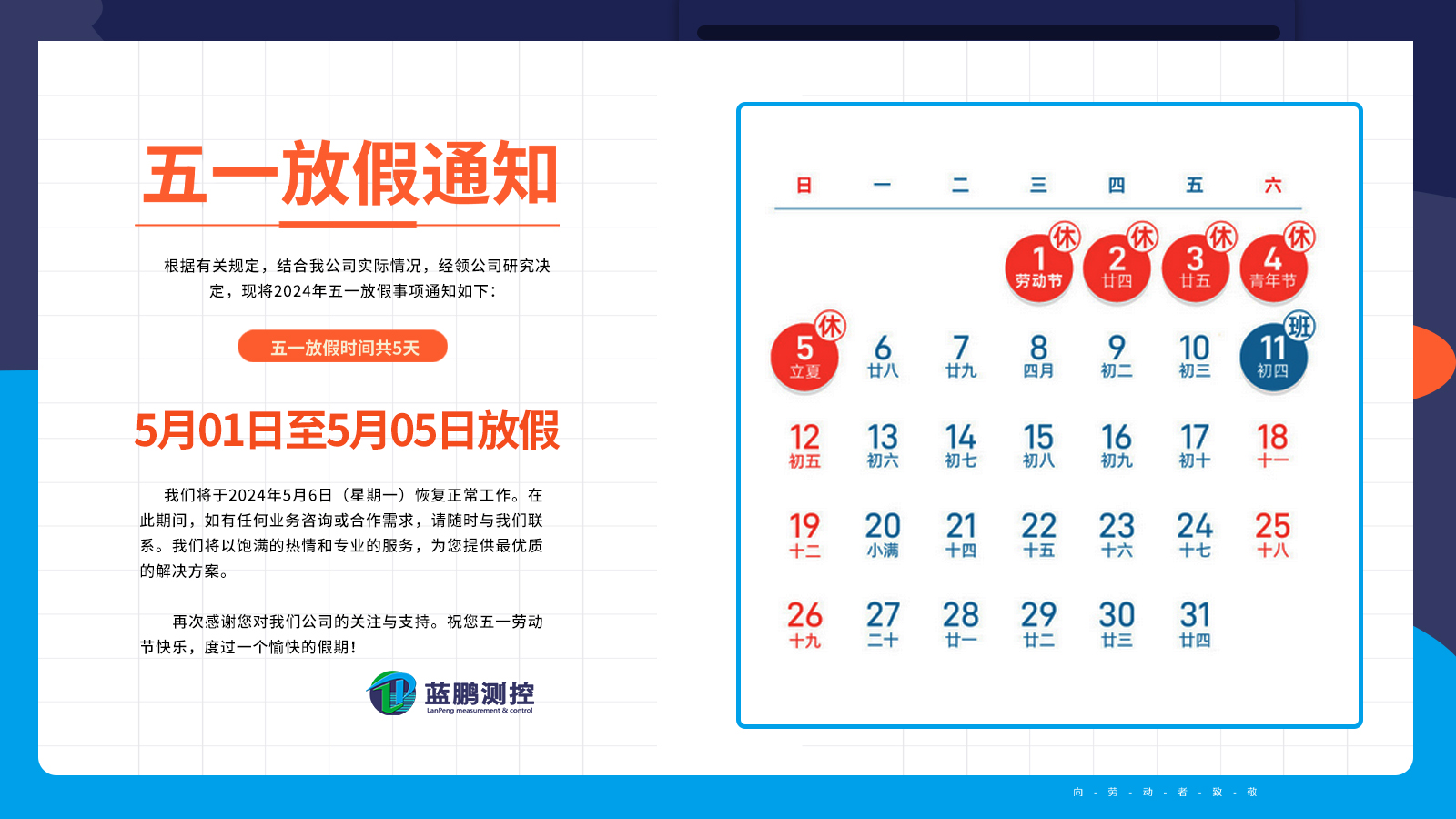 我們將于2024年5月6日(星期一)恢復(fù)正常工作。在此期間,如有任何業(yè)務(wù)咨詢或合作需求,請(qǐng)隨時(shí)與我們聯(lián)系。我們將以飽滿的熱情和專業(yè)的服務(wù),為您提供最優(yōu)質(zhì)的解決方案。再次感謝您對(duì)我們公司的關(guān)注與支持。祝您五一勞動(dòng)節(jié)快樂,度過一個(gè)愉快的假期!